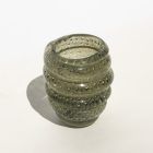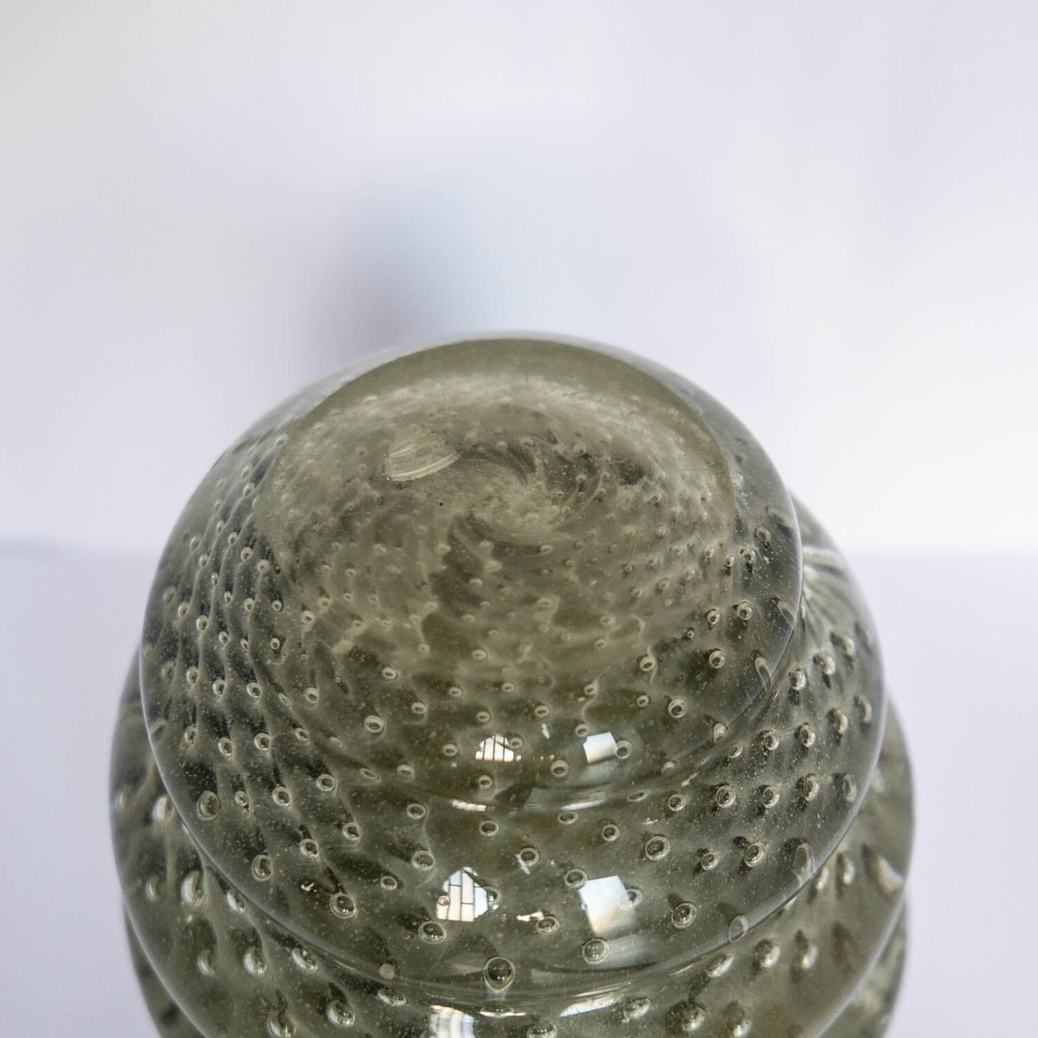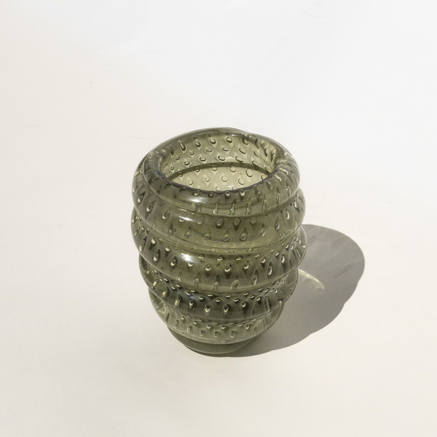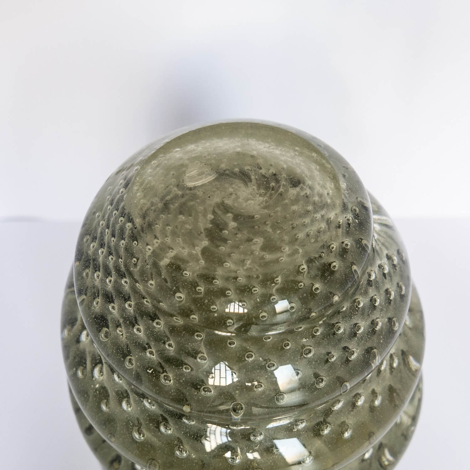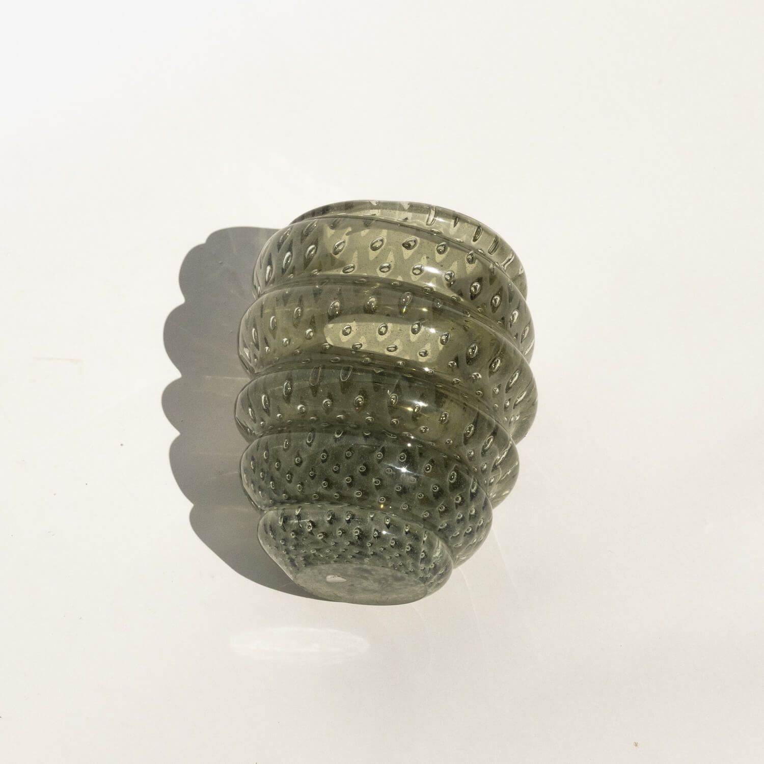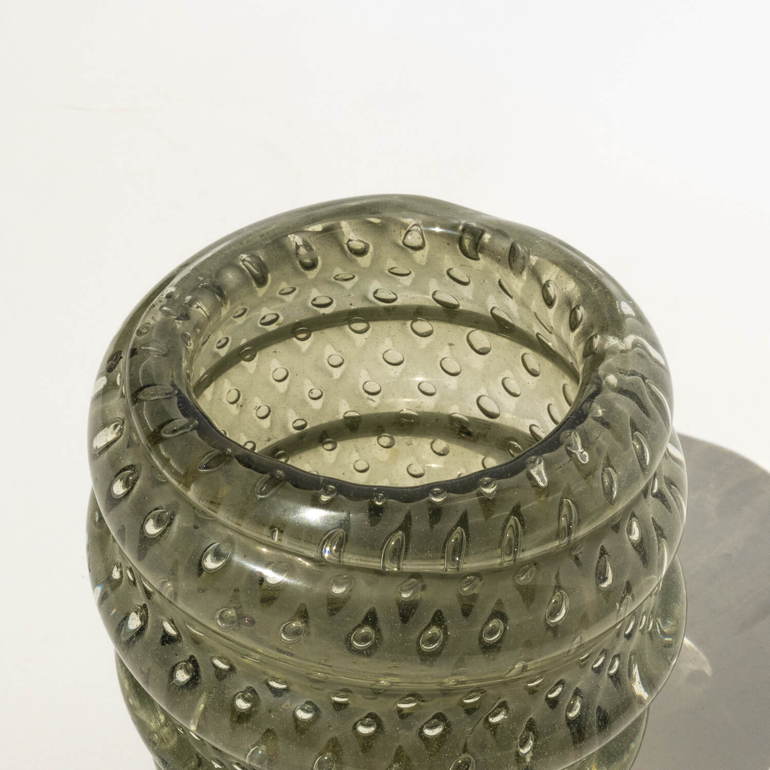 The present vase, which reminds some of the most relevant works of the last century, penned by authors like Carlo Scarpa among others, is a massive and attractive vase in dark green/greyish glass. It is seemingly made by turning a single glass roll around a central core. The starting roll has included bubbles, that make it look like it was filled with water. It is not signed, has been attributed to famed designer and glassmaker Alfredo Barbini.