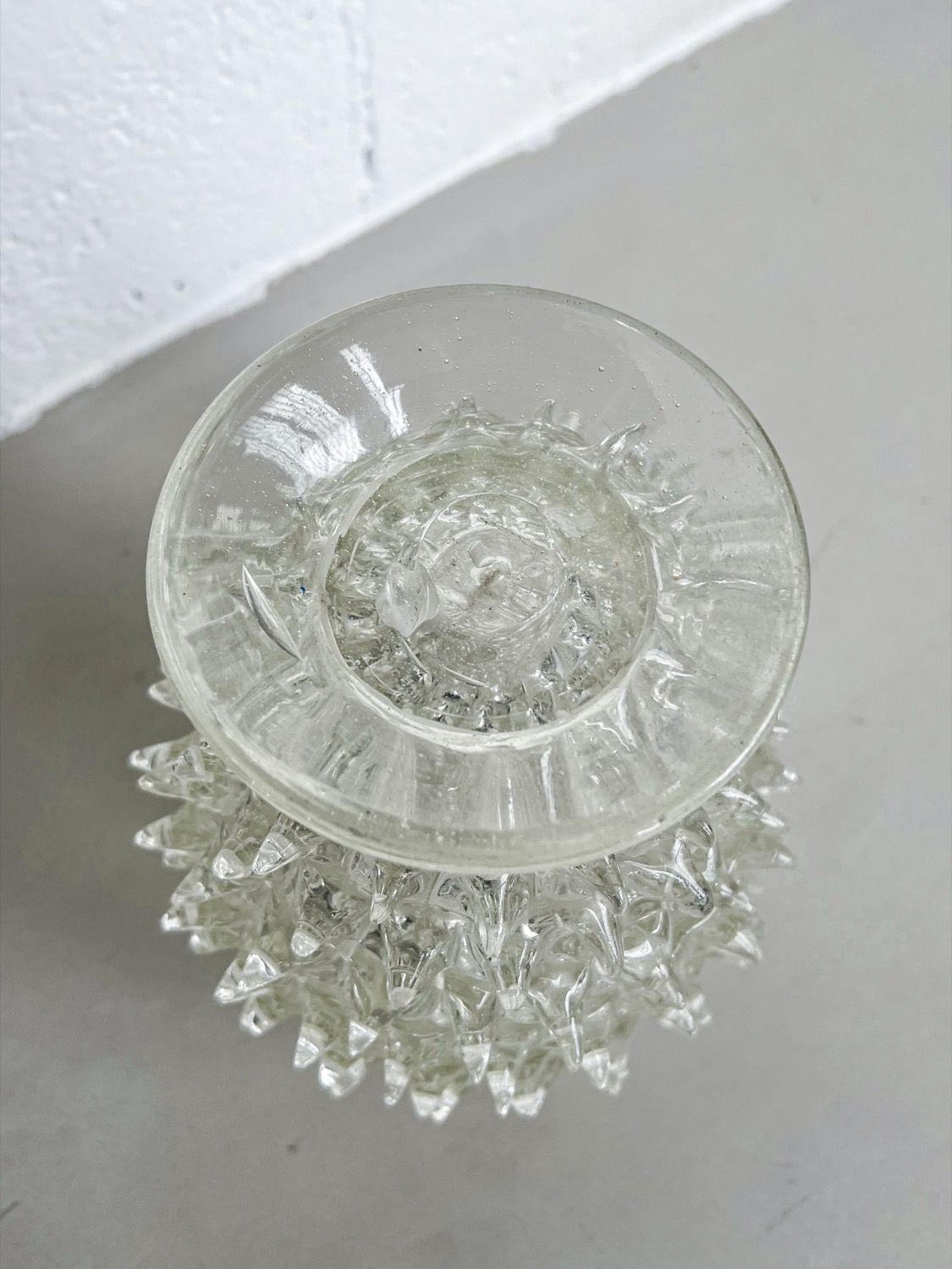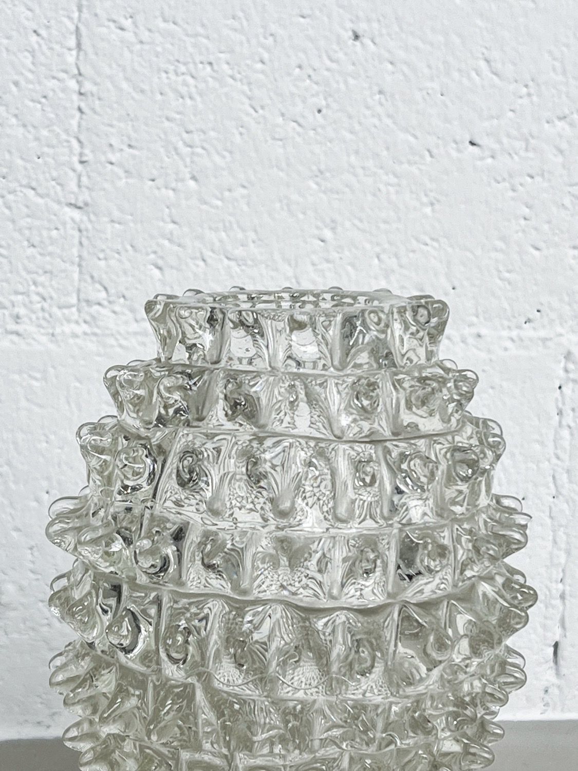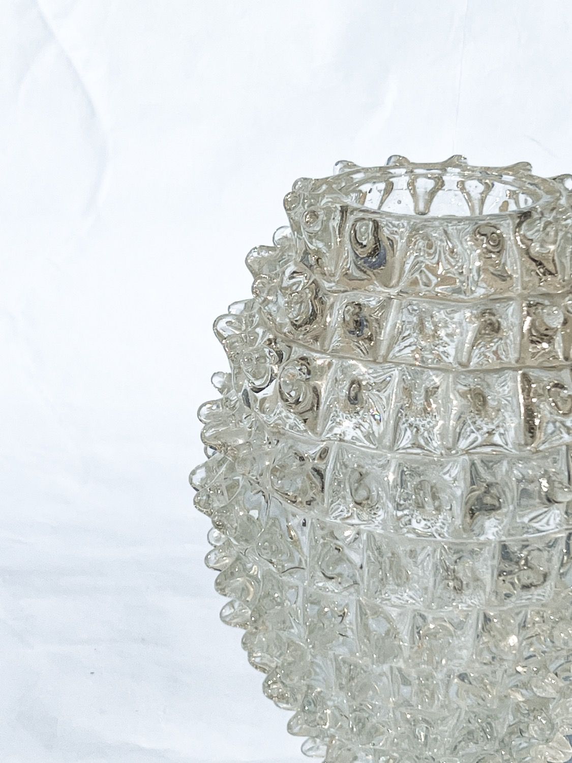 Made in clear “cristallo” glass, and characterized by the spikes (rostri, in italian) protruding from the surface, the pieces are clearly artisanal. Their beauty resides in the small differences between each spike, that give it an irregular, somehow “wabi-sabi” touch.