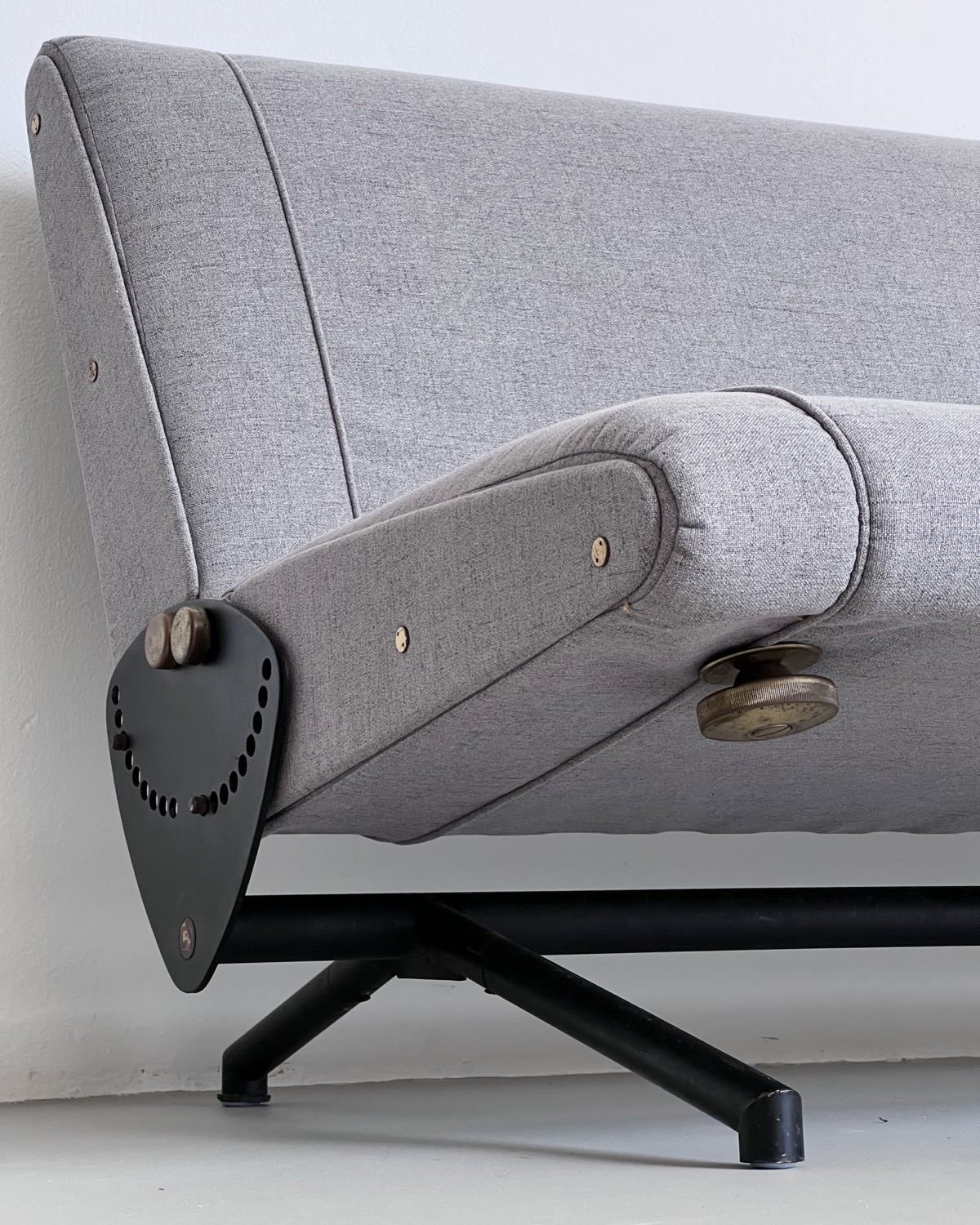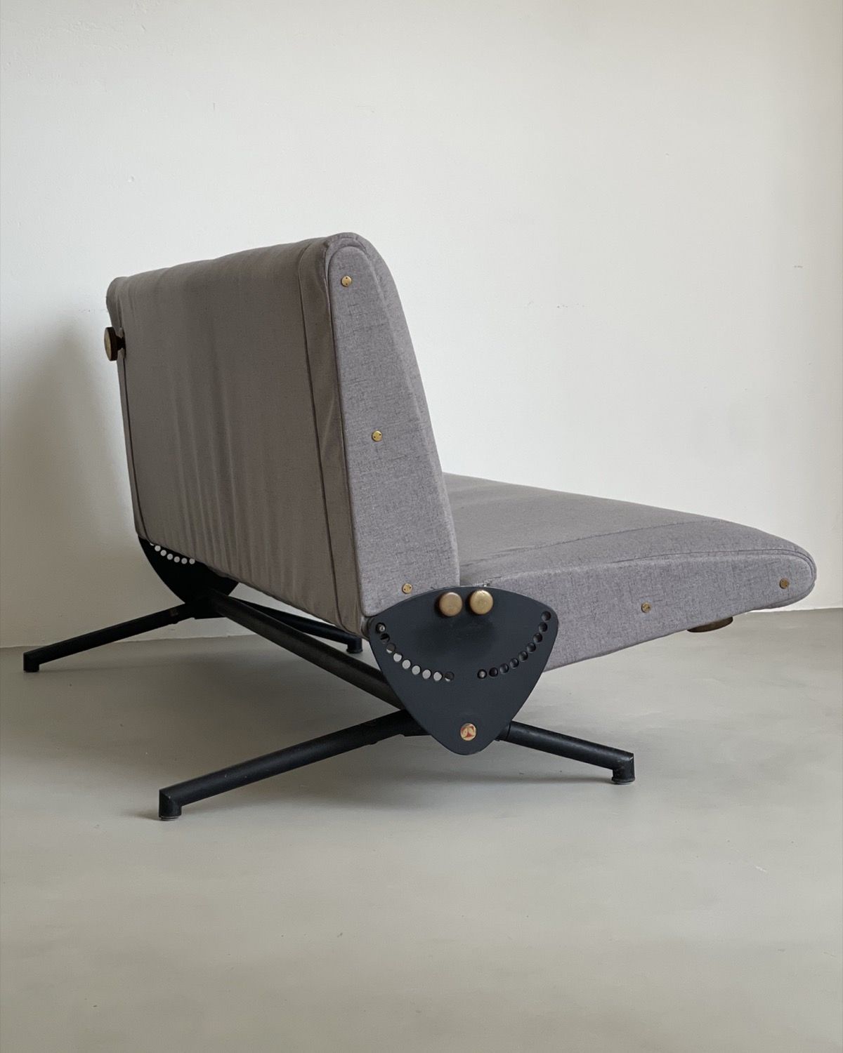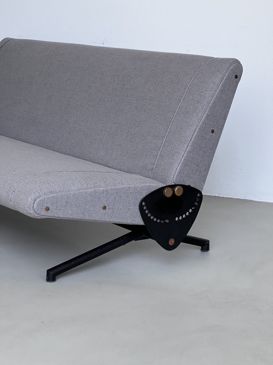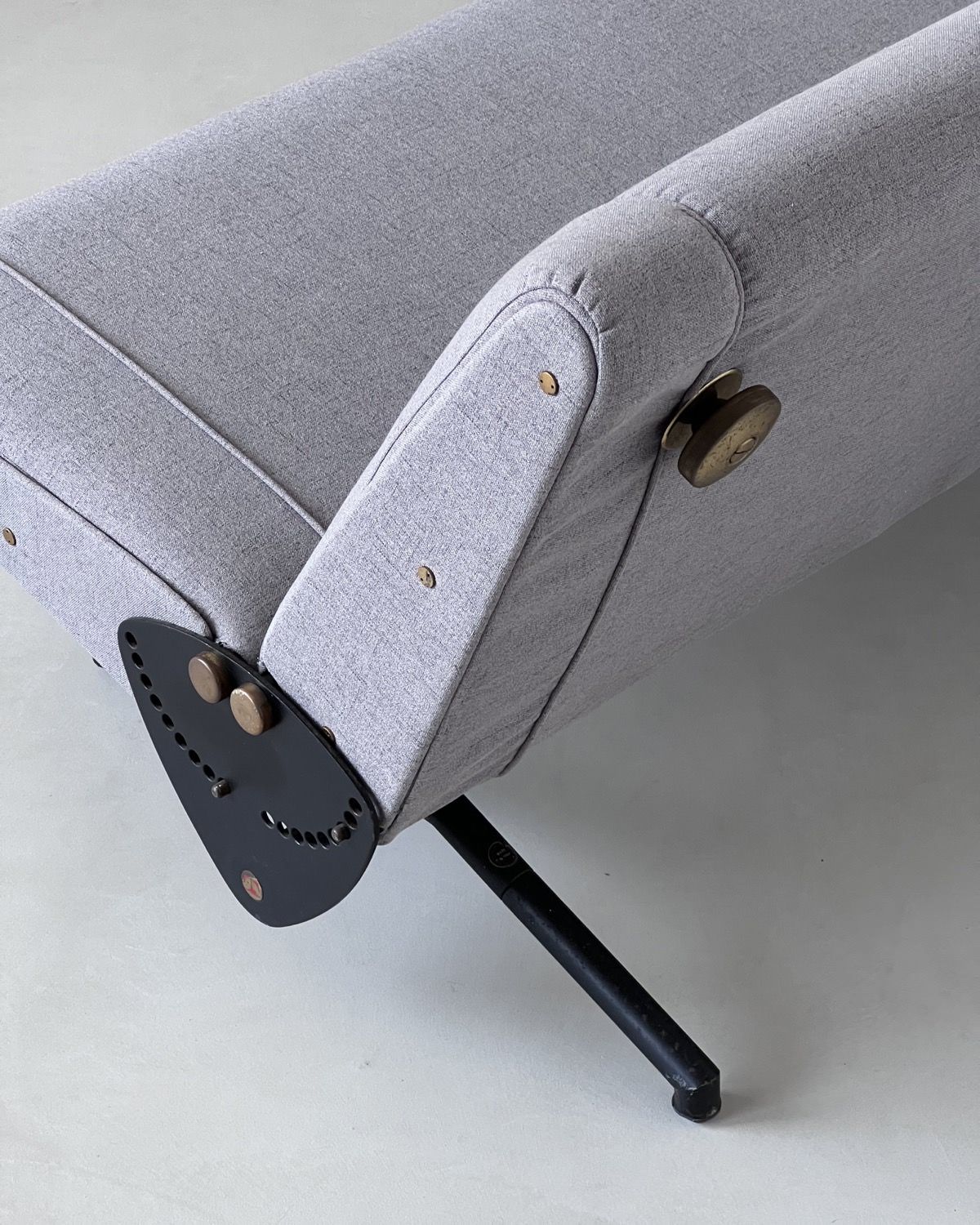 Our D70 has just been redone in grey fabric, and is in stunning conditions. The reclining mechanism works very smoothly on both sides, the legs show nothing more than patina and the original Tecno red logos are still crisp and clearly visible on the side plates.
