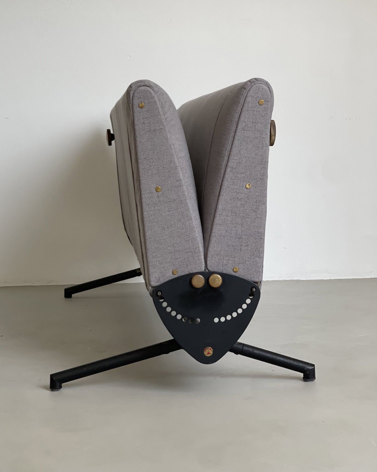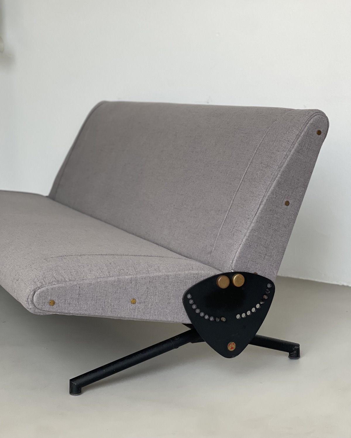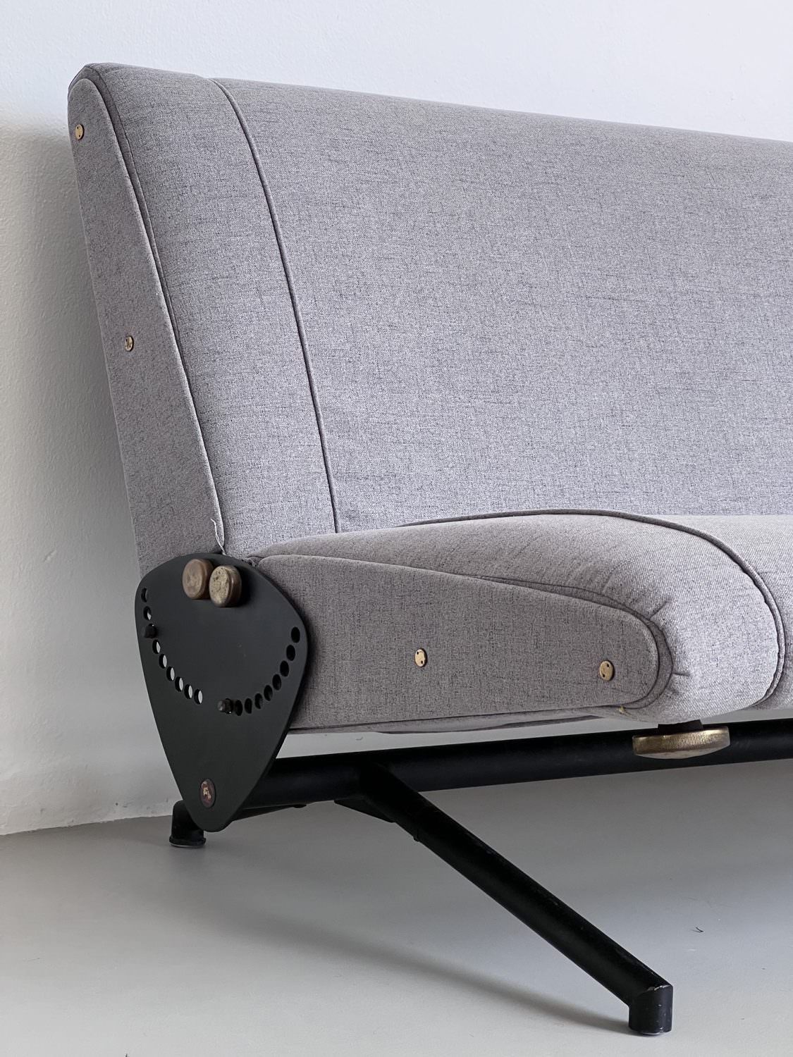 Our D70 has just been redone in grey fabric, and is in stunning conditions. The reclining mechanism works very smoothly on both sides, the legs show nothing more than patina and the original Tecno red logos are still crisp and clearly visible on the side plates.