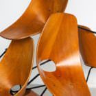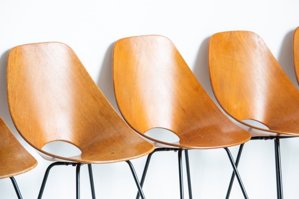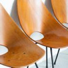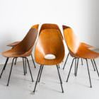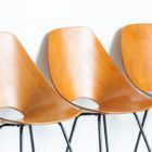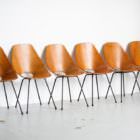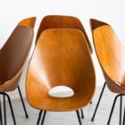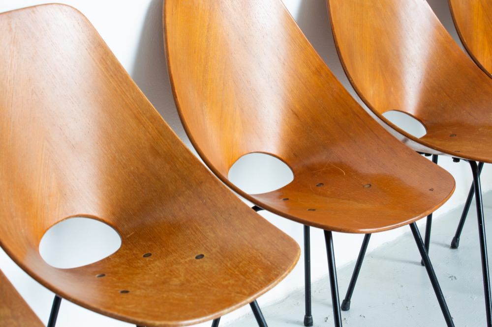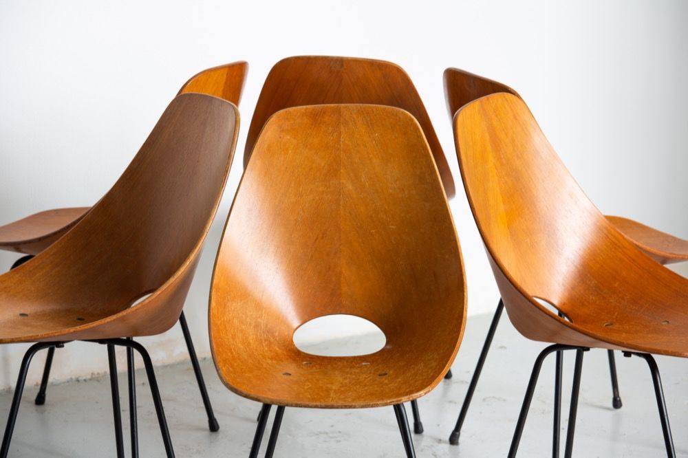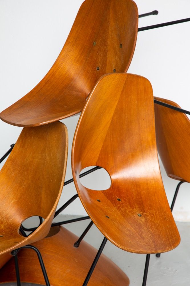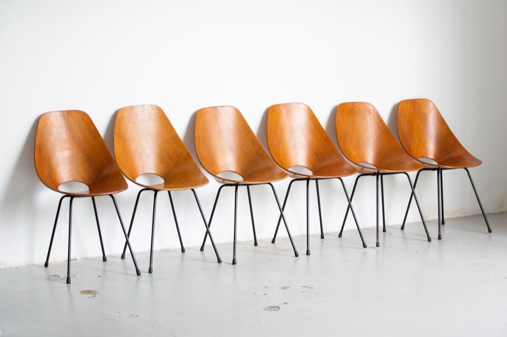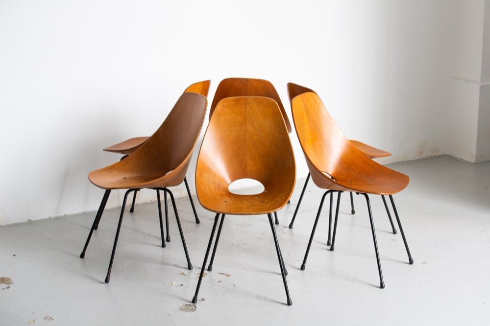 A rare set of six Medea chairs designed by Vittorio Nobili for Italian furniture manufacturer Tagliabue, made in curved wood with black metal legs. An iconic expression of mid-century modern design, perfect to compliment any room.