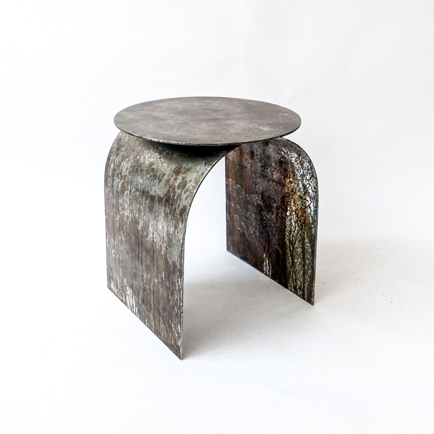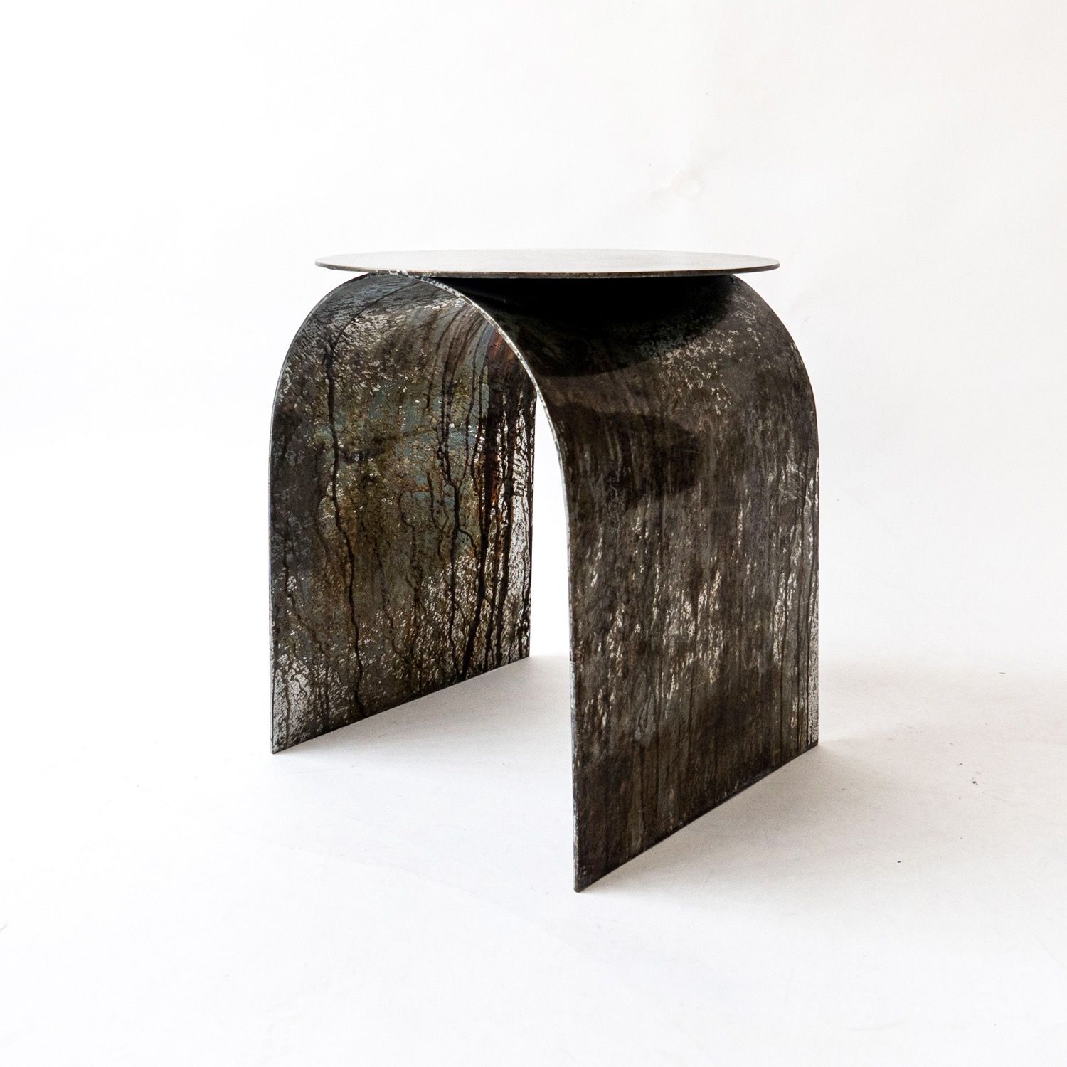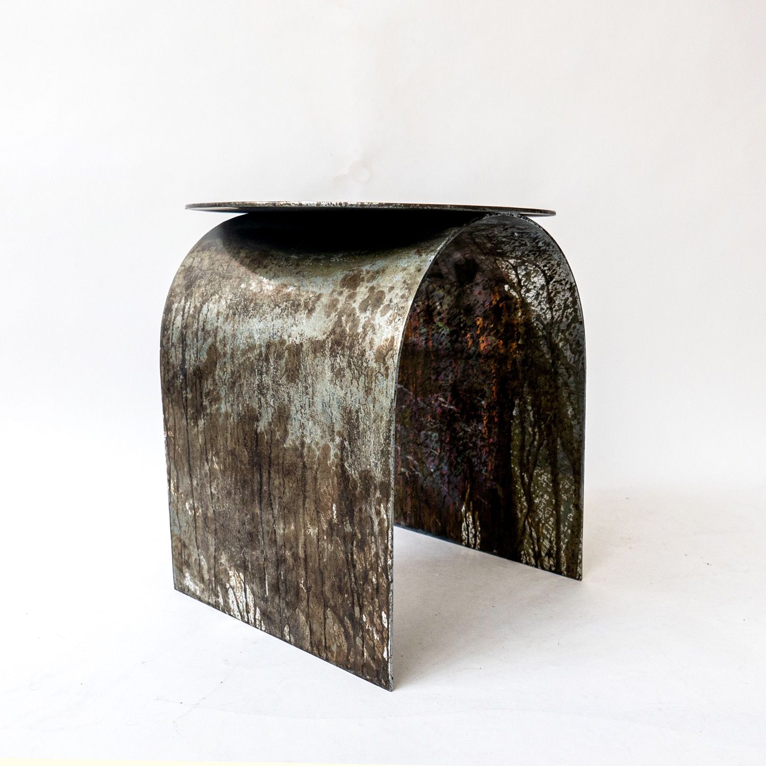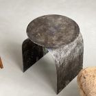 Palladium is our best selling piece. Crafted from air-thin metal, and shaped as an arc to hommage the rich heritage of Italian neo-classical architecture, it is a highly decorative side table / stool.