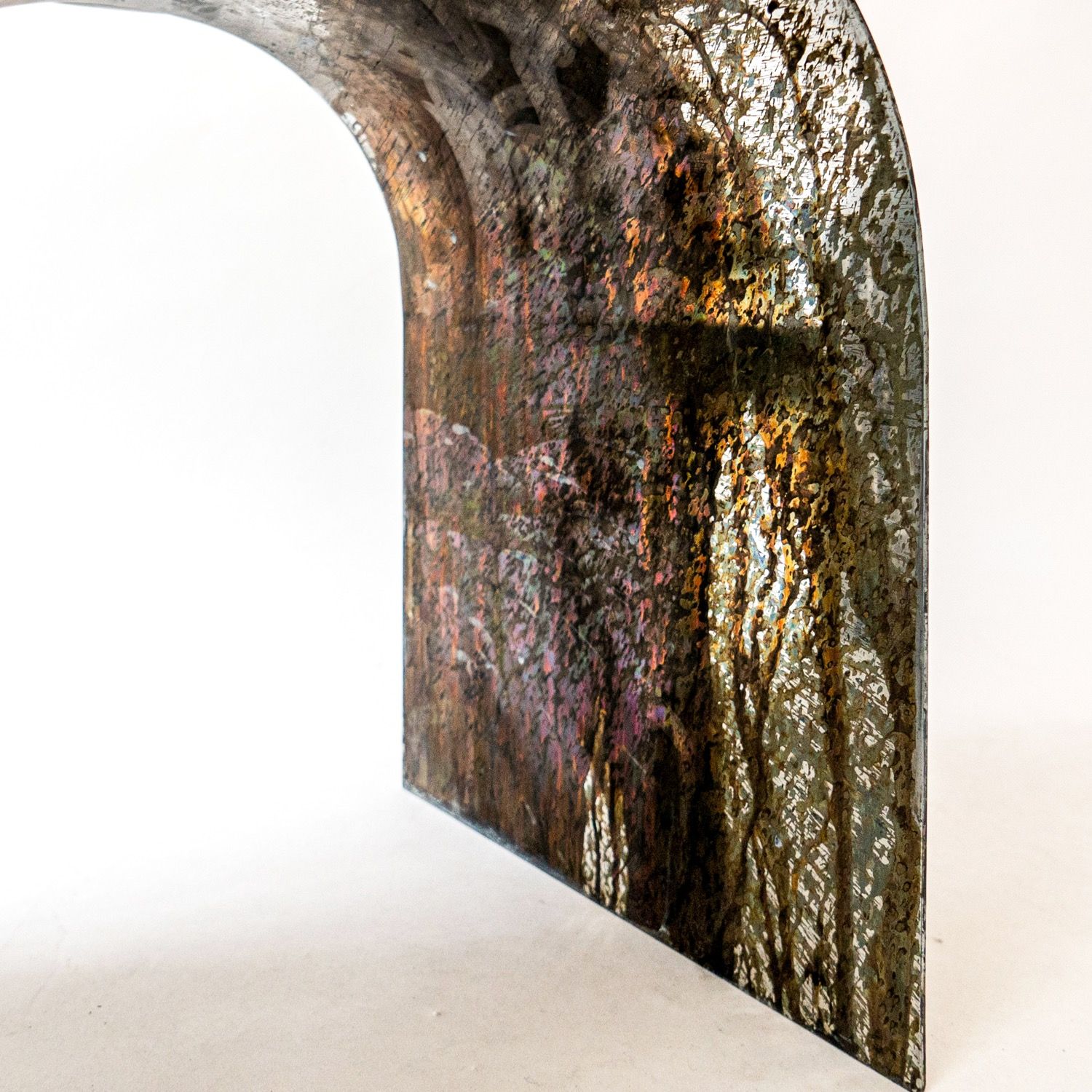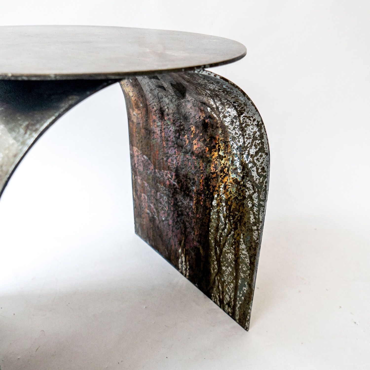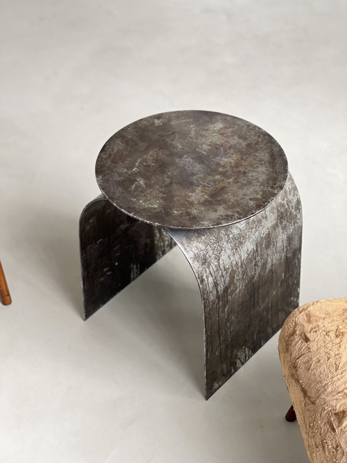 Palladium is our best selling piece. Crafted from air-thin metal, and shaped as an arc to hommage the rich heritage of Italian neo-classical architecture, it is a highly decorative side table / stool.