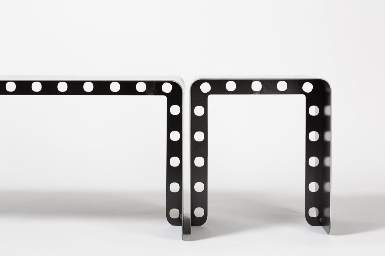 Imagined by Tommaso Spinzi while on a road down his childhood memories filled with days spent playing with the famous construction game “Meccano”, the collection is designed to have the same ingenuity and playful character of the original Meccano.