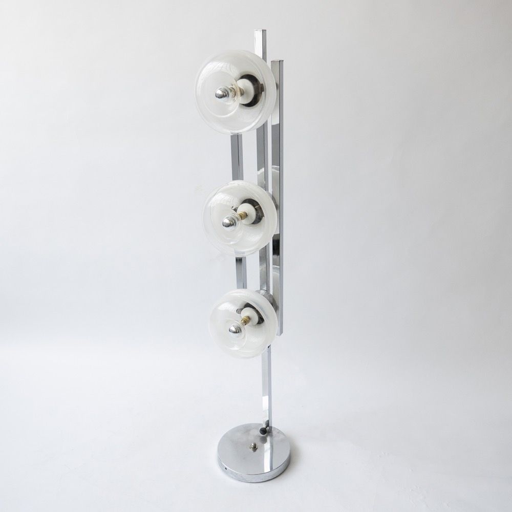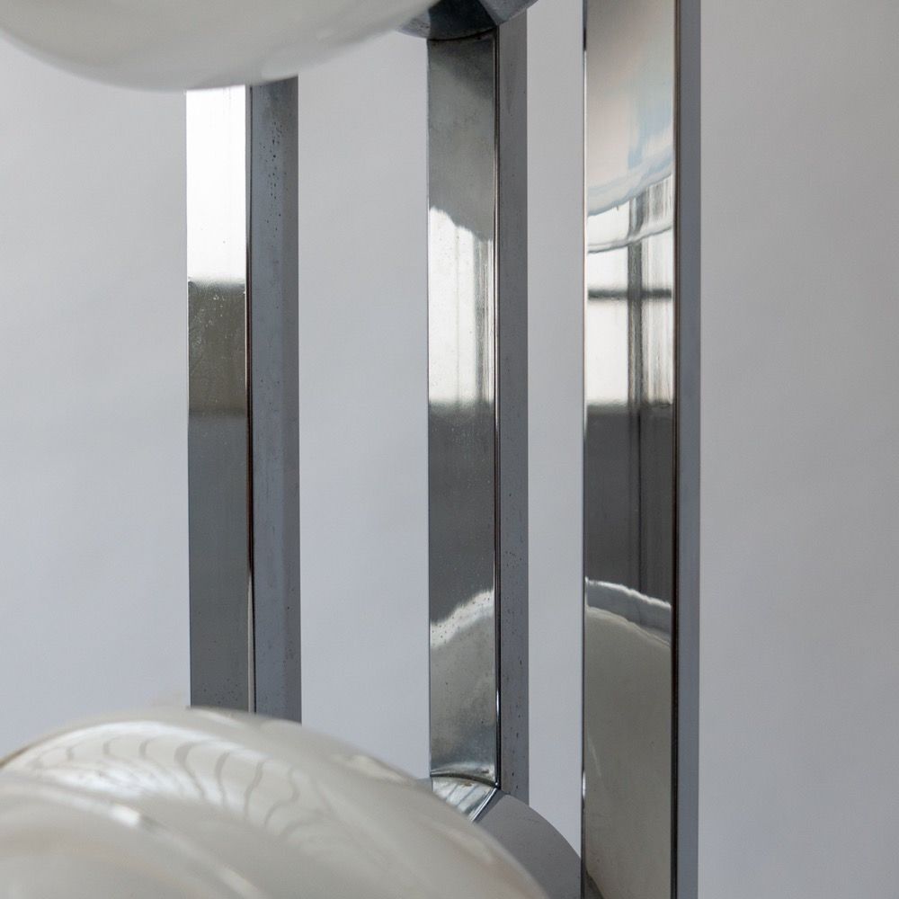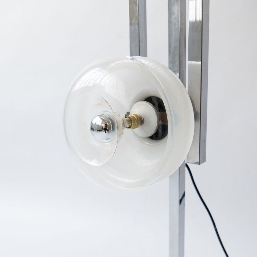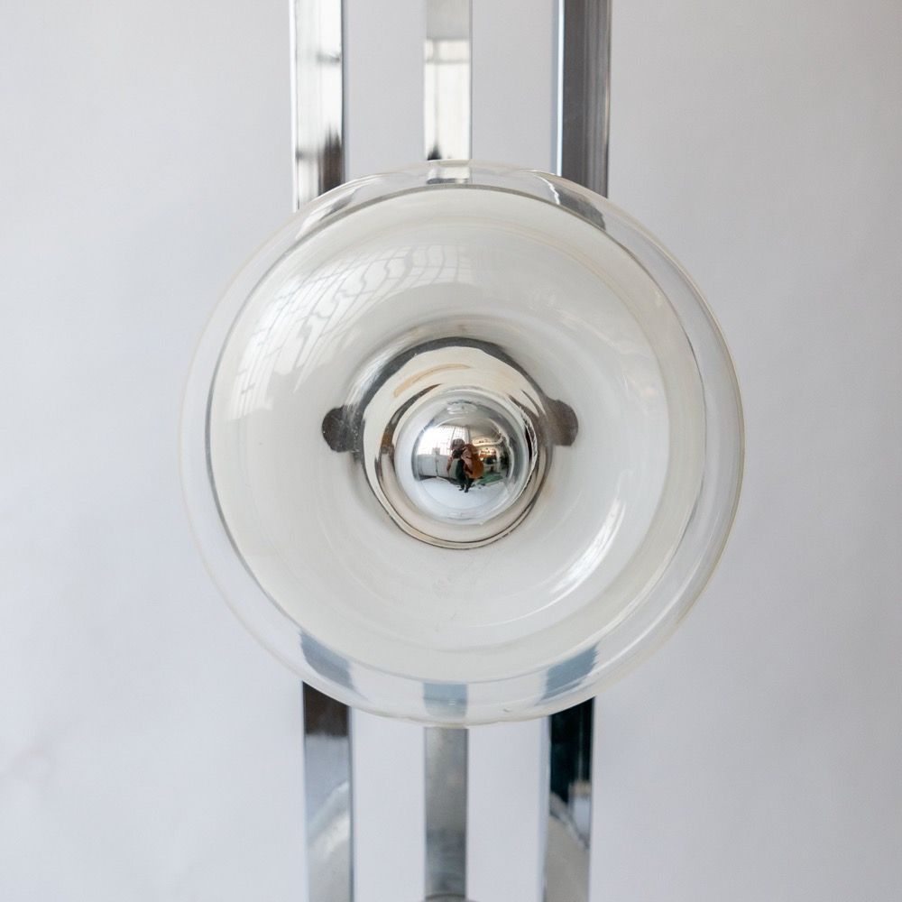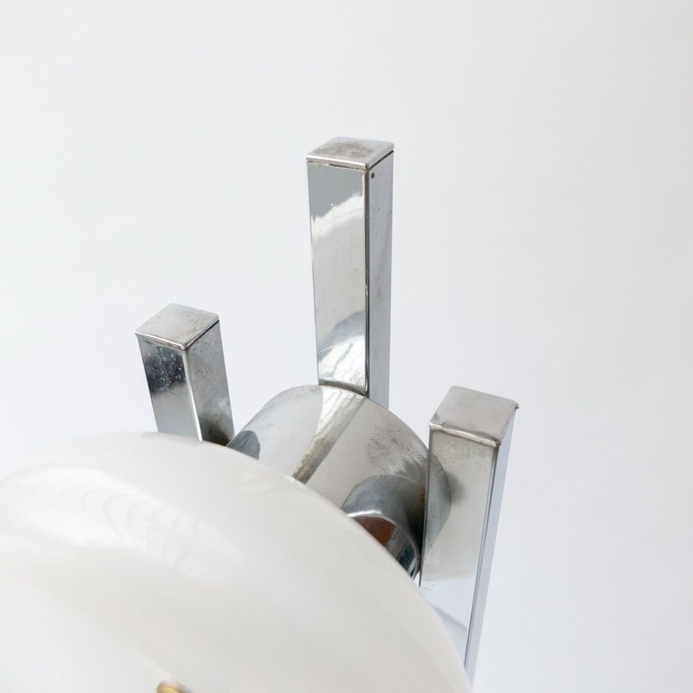 It is, however, gorgeous in its own rights. The original and perfectly preserved glass shades fade from white to transparent, creating a nice effect even when the lamp is turned off. Its three lights provide enough light to liven up even large rooms. The chrome coating is preserved in very good condition, with just the minor fading and patina expectable on an object of this age. The metal frame is very interested in its design, consisting of one main and two side bars, that create a very architectural composition.