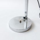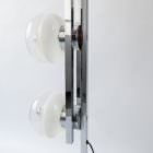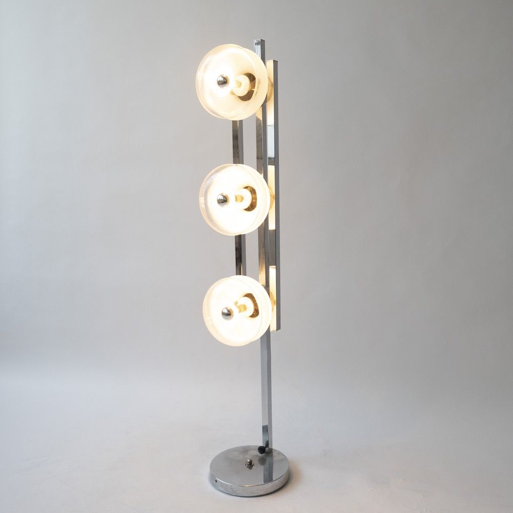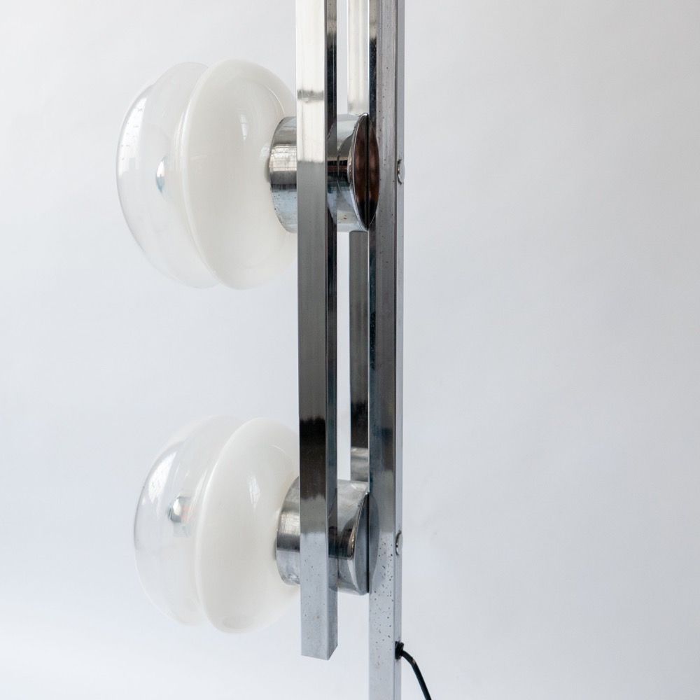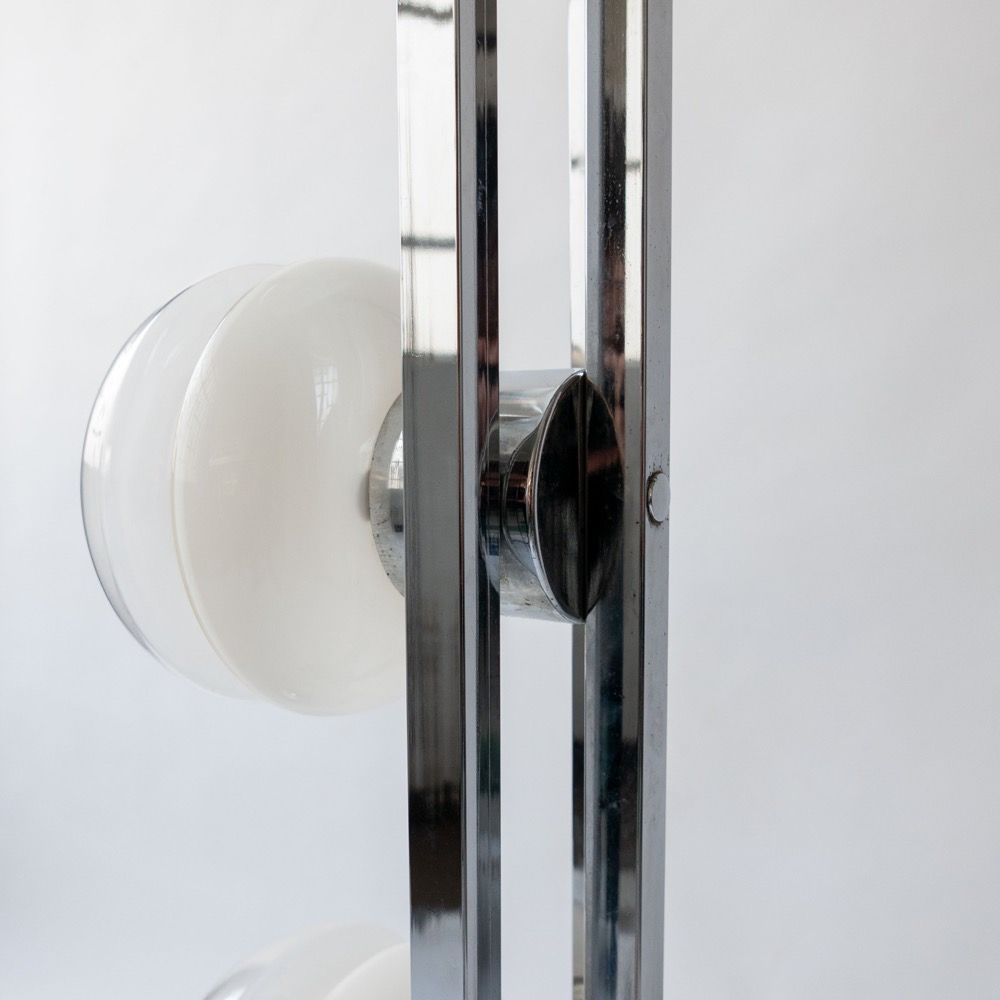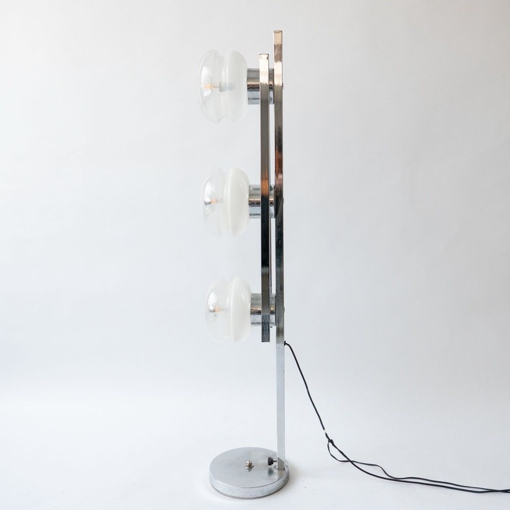 It is, however, gorgeous in its own rights. The original and perfectly preserved glass shades fade from white to transparent, creating a nice effect even when the lamp is turned off. Its three lights provide enough light to liven up even large rooms. The chrome coating is preserved in very good condition, with just the minor fading and patina expectable on an object of this age. The metal frame is very interested in its design, consisting of one main and two side bars, that create a very architectural composition.