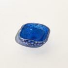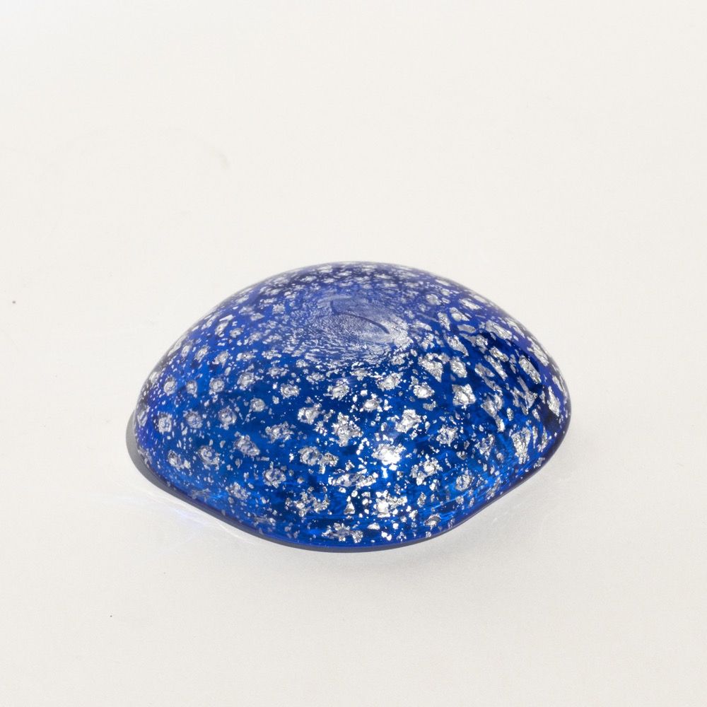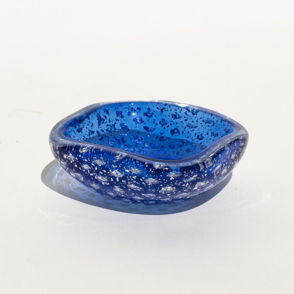 It is the case of the present object, a small ashtray crafted in blue translucent glass with a thin and mesmerizing layer of metallic flakes. Each flake has a bubble underneath it, which enhances the tridimensional effect.